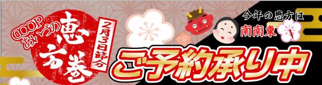 2月3日は節分、コープあいづのお店では「恵方巻」のご予約を承っております。 コープあいづの「恵方巻」は、お店で1本1本心を込めて手作りしております。 少しでもお得に利用いただけますよう、事前予約をしていただきますよう、お願いいたします。 勝手ながら、ご予約の締め切りは1月25日(日)とさせていただきます。 お早めにご予約賜りますよう、お願いいたします。 チラシもご覧になってください。