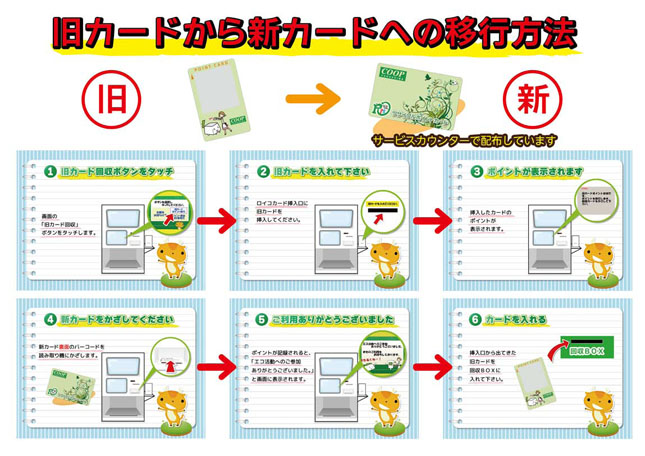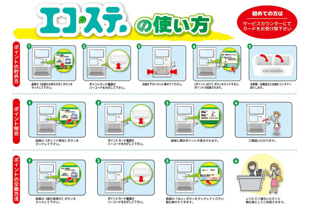 古紙1kg=1ポイント、300ポイントたまると300円割引券発行システムが変更になりました。大変お手数ですがカードの交換をお願いします。