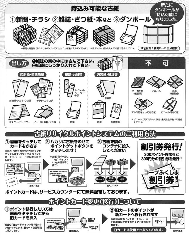 古紙1kg=1ポイント、300ポイントたまると300円割引券発行システムが変更になりました。大変お手数ですがカードの交換をお願いします。