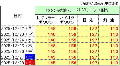 ■2025年12月22日(月)~12月28日(日)の価格(1リットル当り)