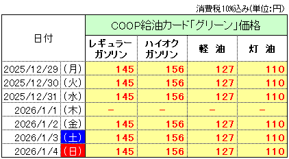 ■2025年12月29日(月)~2026年1月4日(日)の価格(1リットル当り)