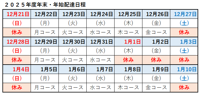 2026年1月1(木)~2026年1月4日(日)は配達休みとなります。