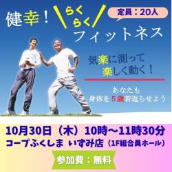 9月8日(月)コープふくしま天神町店2階にてウエルネスサポート&トレーニングna-no-hana代表兼指導者玉木尚子さんを講師に「心も体もスッキリ!簡単椅子体操」を行いました。先生の優しい声も心地よく時々笑いを交えての説明は心も元気になりました。参加者からは・椅子に座って無理のない運動だったが身体が...