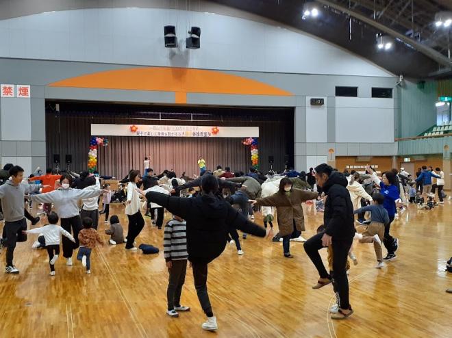 郡山市の品川市長からご挨拶をいただき、いよいよ体操がスタートすると子どもたちは飛んだり、跳ねたり、抱っこされたり、会場は一気に子どもたちの元気な声が響きました。また、休憩時間の大人たちからは日ごろの運動不足を反省する笑い声も聞かれるなど、寒さも吹き飛ぶ熱気にあふれた親子体操教室になりました。「とても良い親子の時間をありがとうございました」とお声がけくださった参加者に、スタッフ一同も心温まるイベントになりました。