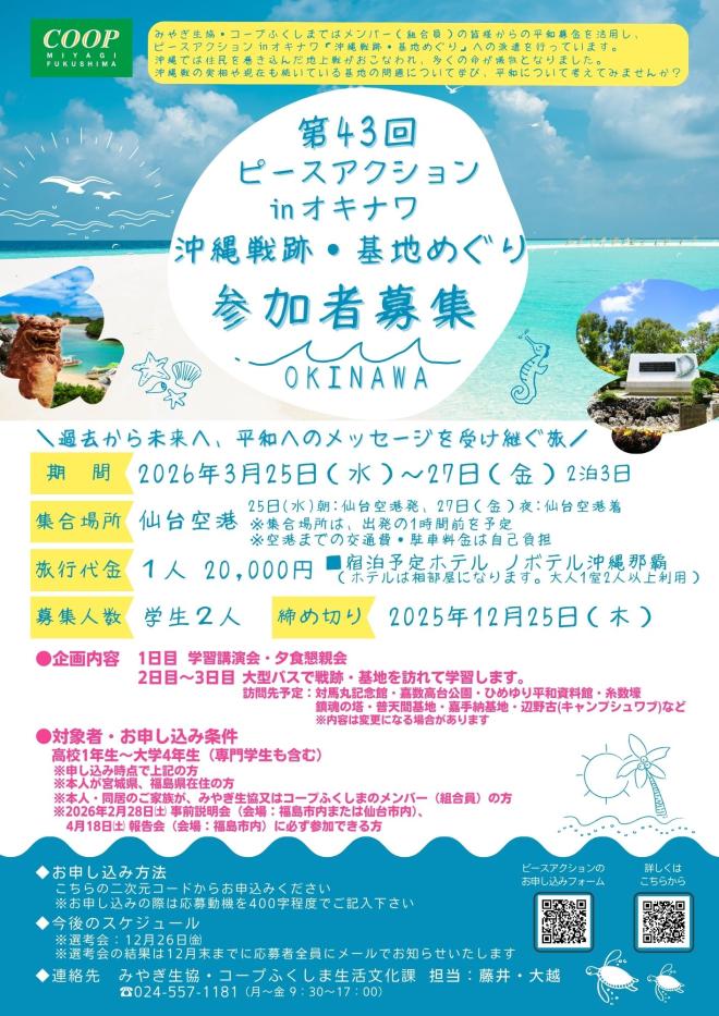 みやぎ生協・コープふくしまではメンバー(組合員)の皆様からの平和募金を活用し、ピースアクションinオキナワ「沖縄戦跡・基地めぐり」への派遣を行っています。沖縄では住民を巻き込んだ地上戦がおこなわれ、多くの命が犠牲となりました。沖縄戦の実相や現在も続いている米軍基地の問題について、全国の生協からの参加者と一緒に学び、平和について考えます。