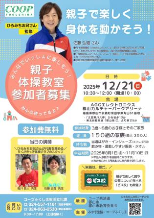 子どもの健やかな成長のために大切な運動♬親子で元気な身体づくりを目指し、一緒に楽しく身体を動かしてみませんか?親子のふれあいや親御さんの運動不足解消も応援します!日時:2025年12月21日(日)10:30~12:00(開場10:00)会場:AGCエレクトロニクス郡山カルチャーパークアリーナ(福島県郡山市安積町成田字東丸山61番地)参加対象:3歳~8歳のお子さまとそのご家族定員:150組の家族(最...