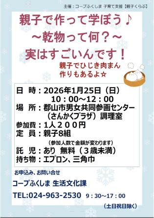 親子で作って学ぼう♪~乾物って何?~実はすごいんです!親子でひじき肉まん作りもあるよ☆日時:2026年1月25日(日)10:00~12:00場所:郡山市男女共同参画センター(さんかくプラザ)調理室参加費:1人200円定員:親子8組(参加人数で金額が変わります)託児:あり無料(3歳未満)持ち物:エプロン・三角巾栄養がギュッと凝縮されていて保存性の高い乾燥野菜が、手軽に美味しく大変身♪親子で一緒に作っ...
