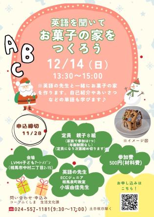 英語講師の小坂由佳さんをお招きし、英語で説明をしていただきながらお菓子の家を完成させます。英語をもっと身近に感じ、物づくりを通して楽しみながら学んでみませんか?挨拶や自己紹介、簡単なコミュニケーションなどマスターしちゃおう!日時:12月14日㈰13時30分~15時会場:LVMH子どもアート・メゾン住所:相馬市中村2丁目2-15定員:親子8組※家族で参加は1つ※年齢制限なし※定員になり次第締め切りま...